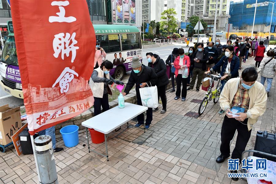 2月23日,市民排队领取消毒清洁剂。当日,香港工联会在将军澳向市民免费派发消毒清洁剂。新华社记者卢炳辉摄
