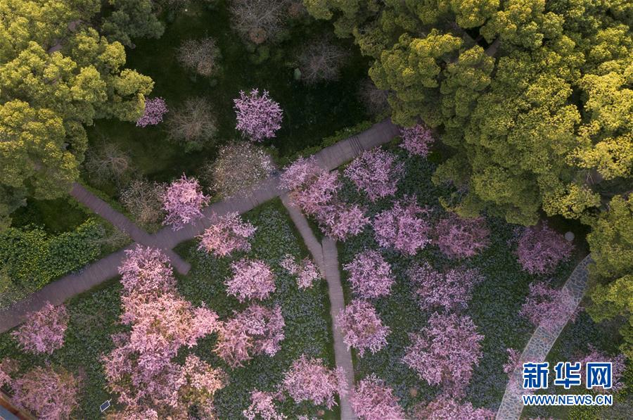 这是3月14日拍摄的武汉东湖磨山樱园景色(无人机照片)。近日气温渐升,武汉东湖磨山樱园里的樱花渐次盛开,带来春天的气息。新华社记者熊琦摄