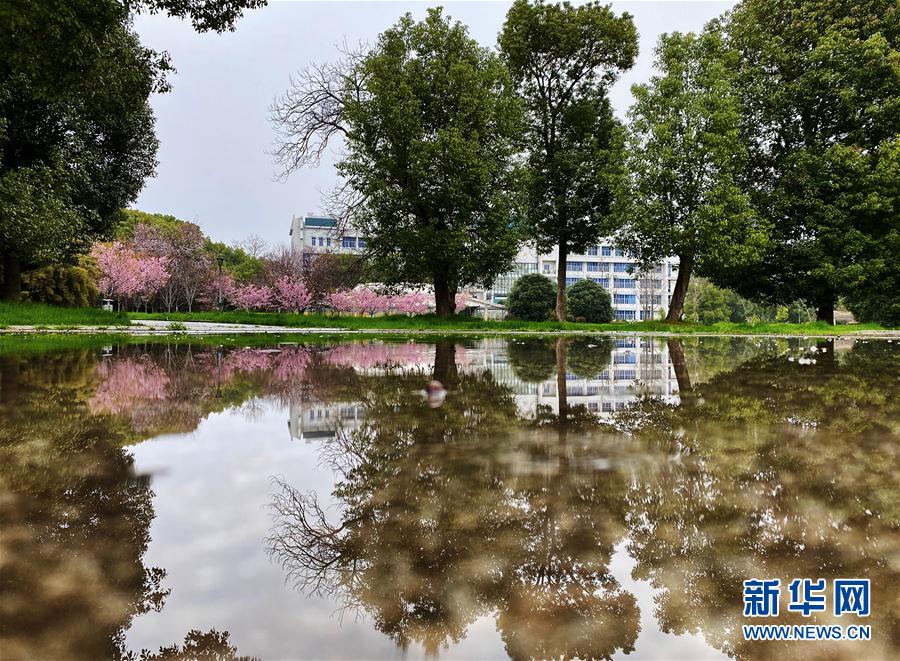 近日,随着气温上升,武汉大学图书馆附近一片樱花开放。新华社记者费茂华摄