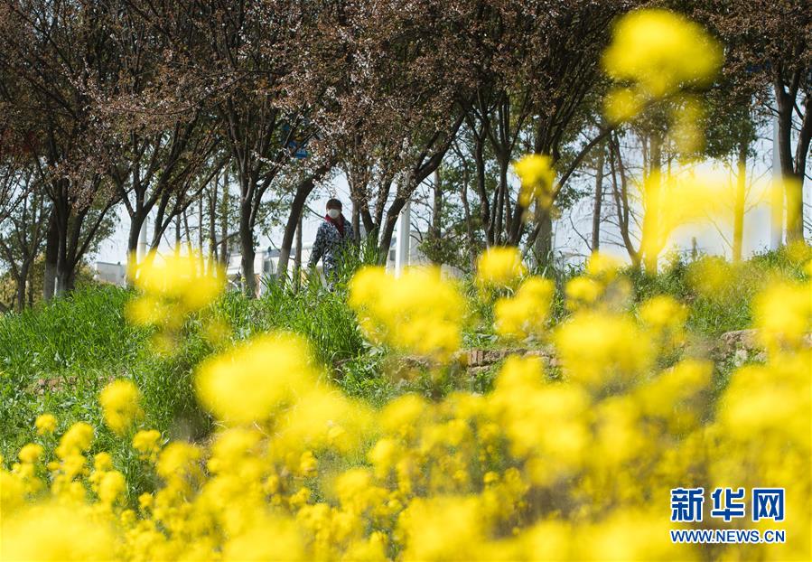 3月14日,在武汉市西北部市郊,一名市民从油菜花田前走过。随着气温升高,春意在武汉的枝头上萌动,花朵渐次开放。新华社记者肖艺九摄