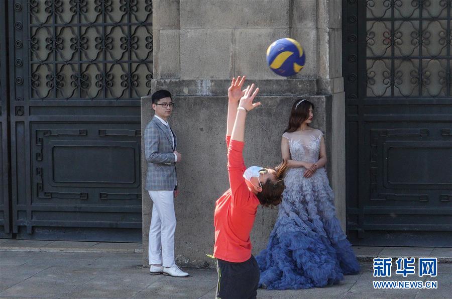 3月15日,在南京东郊体育公园,一对新人在一名练习排球的市民旁拍摄婚纱照。 当日,南京风和日丽,市民们来到东郊体育公园,踏青春游。 新华社记者 杨磊 摄