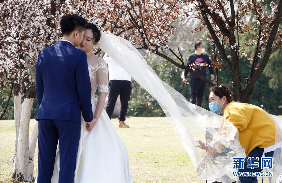 3月15日,在南京东郊体育公园,一名摄影助理给一对拍摄婚纱照的新人整理婚纱。 当日,南京风和日丽,市民们来到东郊体育公园,踏青春游。 新华社记者 杨磊 摄