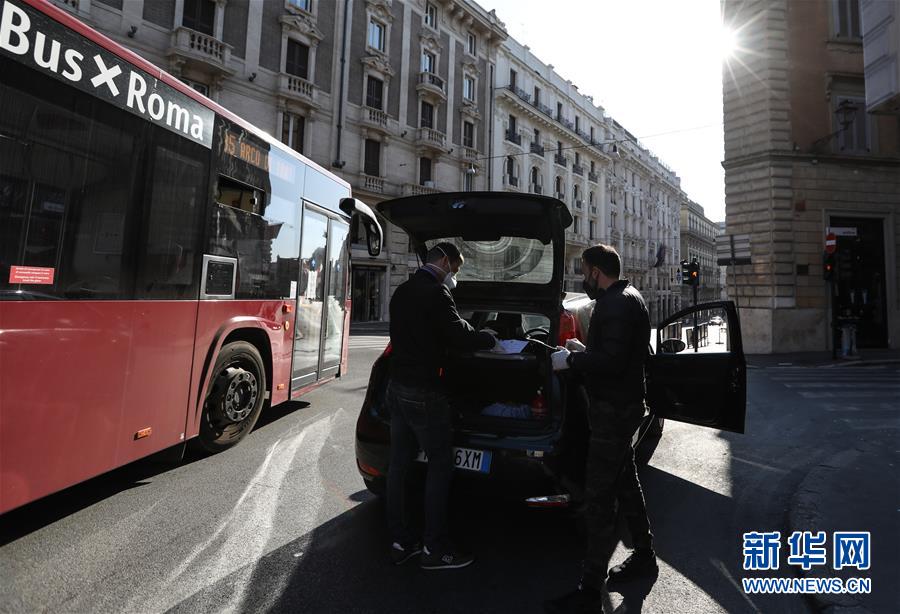 3月16日,在意大利首都罗马,两名便衣警察查验人们出行的“自我声明”以及身份证件。新华社记者程婷婷摄