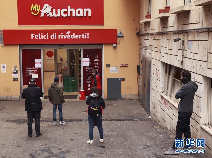 3月14日,在意大利首都罗马,顾客排队等待进入超市。新华社记者刘咏秋摄