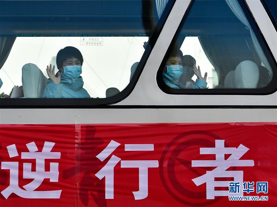 3月17日,医疗队队员在青海西宁曹家堡国际机场向前来接机的人们挥手致意。随着湖北新冠肺炎疫情形势好转,当日,援鄂医疗队开始有序撤回,陆续抵达各地。新华社记者张龙摄
