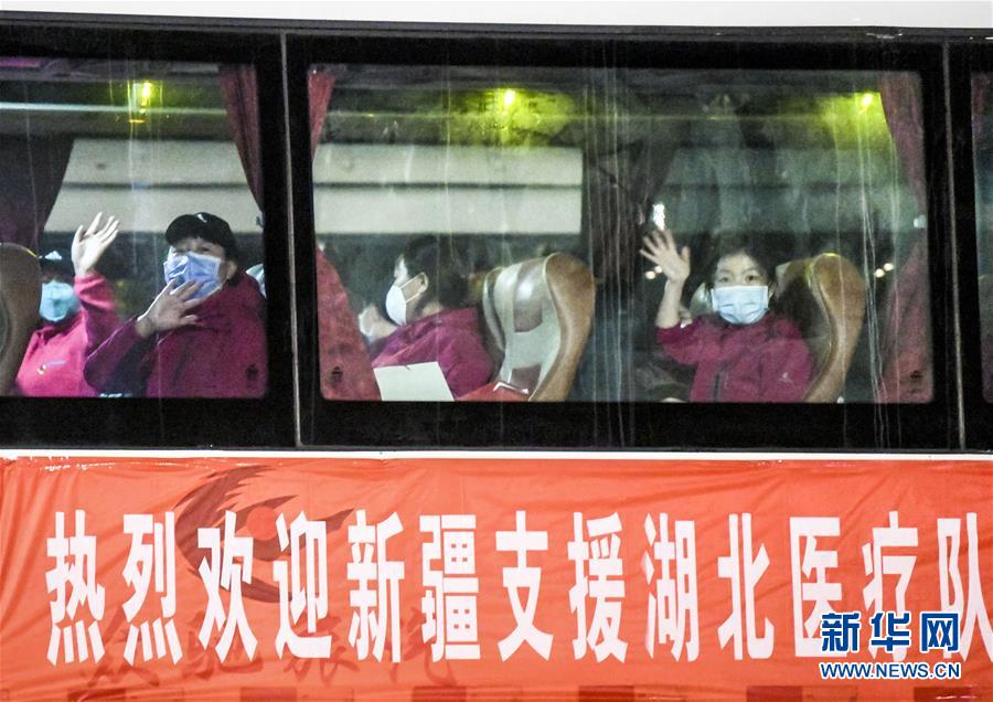 3月17日,在新疆乌鲁木齐地窝堡国际机场,医疗队队员坐上大巴车准备离开。新华社记者王菲摄