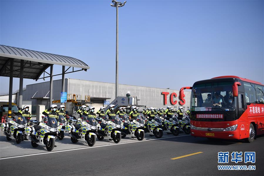 3月17日,医疗队队员乘坐大巴车离开天津滨海国际机场。新华社记者李然摄
