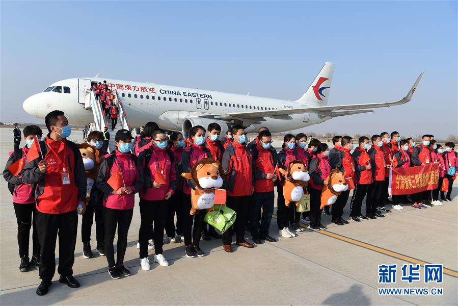 3月17日,医疗队队员抵达甘肃兰州中川国际机场。新华社记者范培珅摄