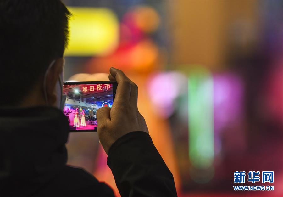 3月16日,在和田夜市环湖店,食客用手机拍摄夜市上的舞蹈节目。新华社记者 赵戈 摄
