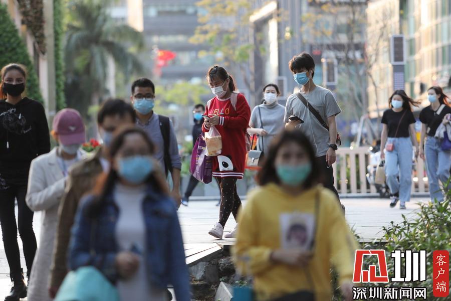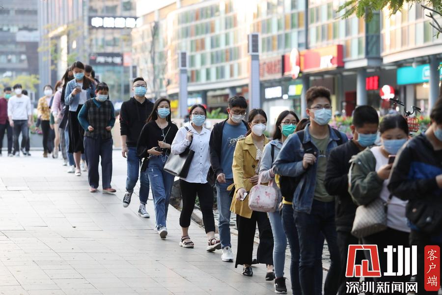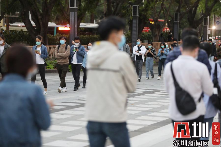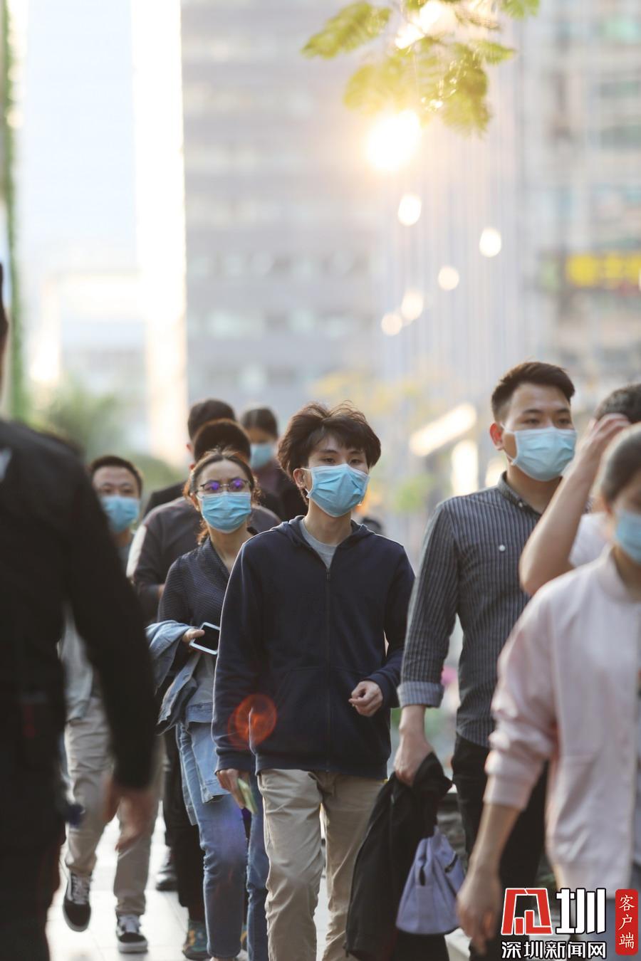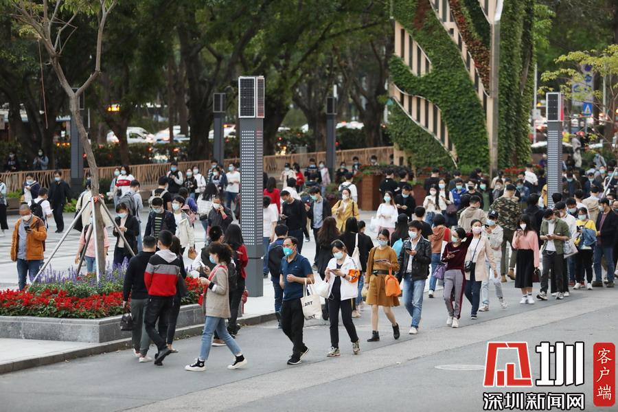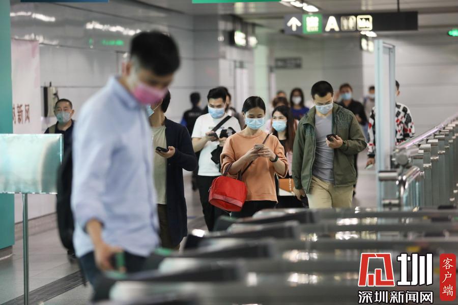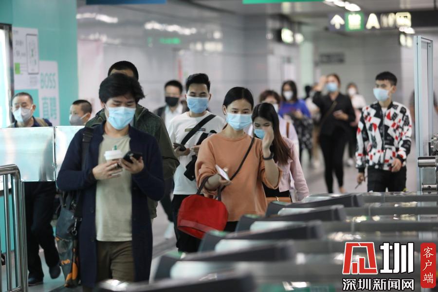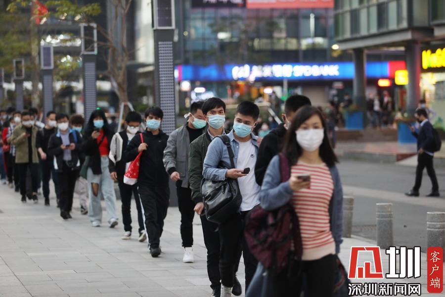 见圳客户端·深圳新闻网2020年3月19日讯 下班时间,深圳地铁一号线深大站A3出口外,下班后的市民在站外排大排长龙,依次有序进入地铁站乘坐列车回家。