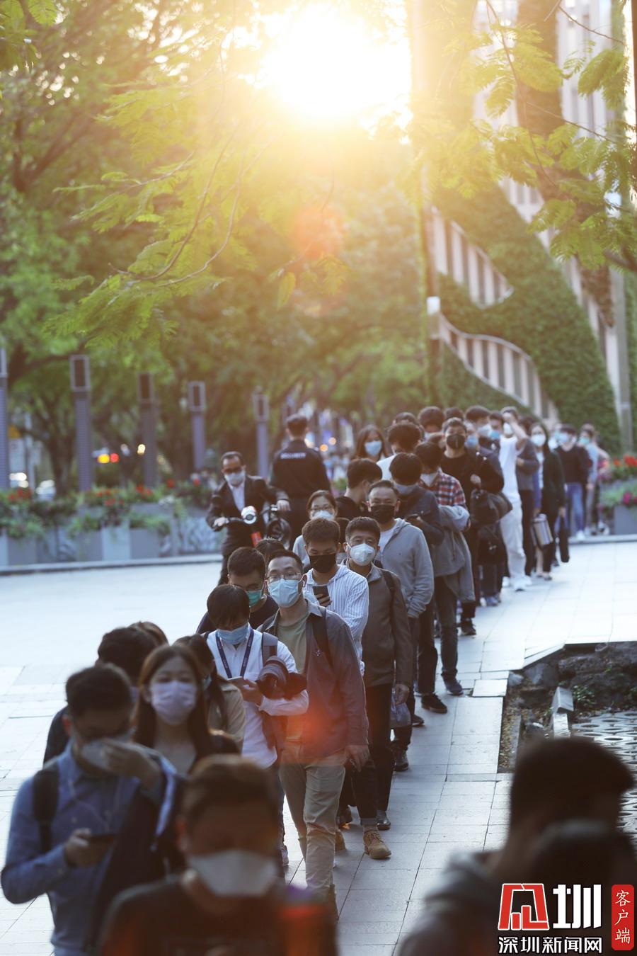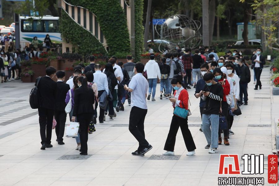 据悉,深圳地铁实行客流管控,控制车站人员密度。由于下班高峰客流量较大,“人龙”排到一旁的科技园文化广场,形成“蛇饼”队伍,秩序却十分井然。