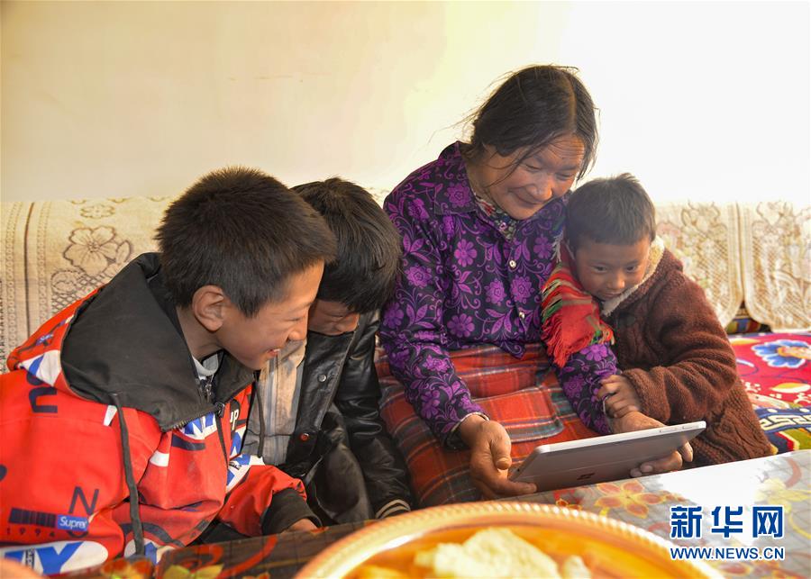 在西藏山南市贡嘎县森布日安置点的新家里,看到记者从双湖带来爸爸妈妈的视频留言,15岁的尼玛次仁(左一)和奶奶以及弟弟妹妹笑得合不拢嘴(1月12日摄)。新华社记者田金文摄