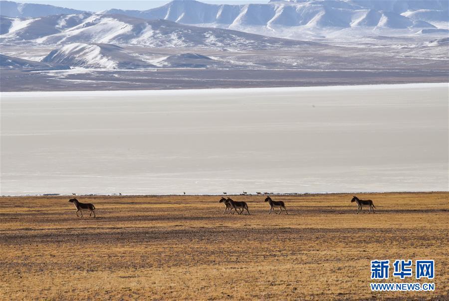 一群藏野驴在羌塘草原上奔跑(1月10日摄)。新华社记者周健伟摄