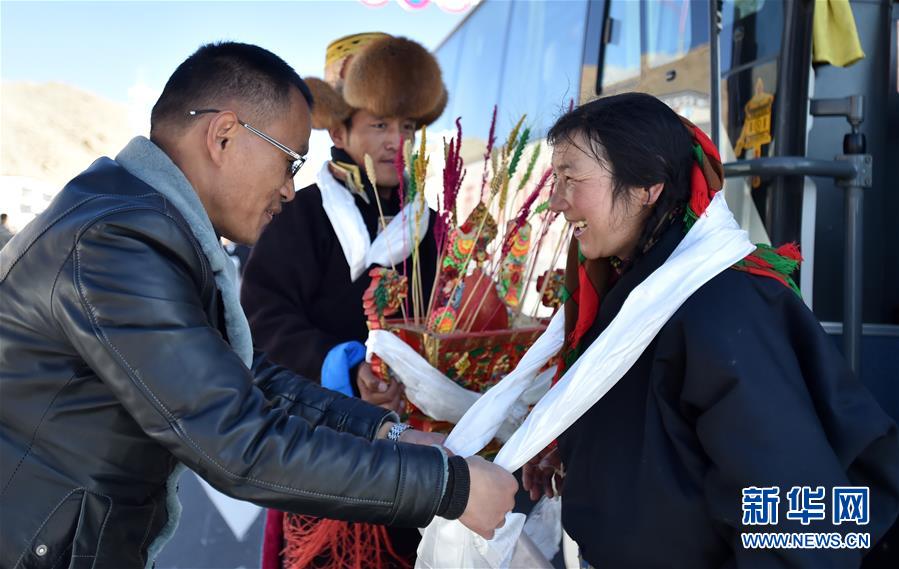 12月23日,贡嘎县群众迎接新来的村民。新华社记者觉果摄