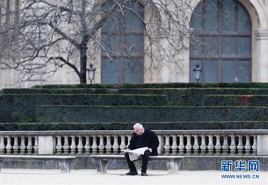 3月18日,在法国巴黎,一名男子在路边看报。新华社记者高静摄