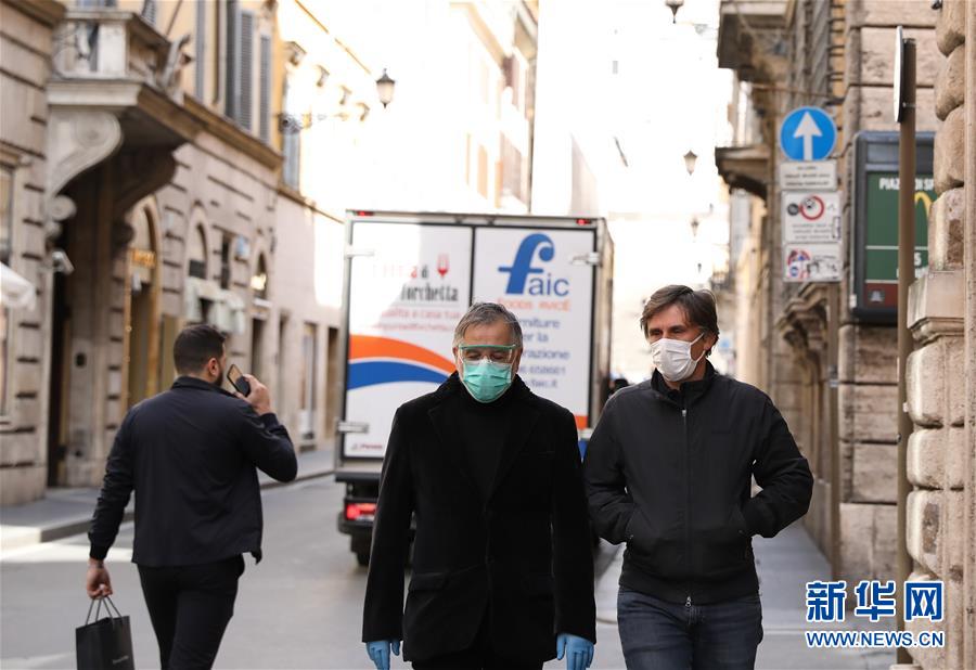 3月10日,在意大利首都罗马,两名男子戴着口罩出行。新华社记者程婷婷摄