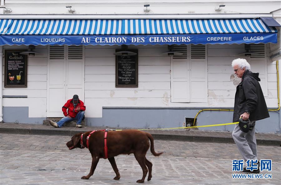 3月18日,在法国巴黎,一名男子在蒙马特高地遛狗。新华社记者高静摄
