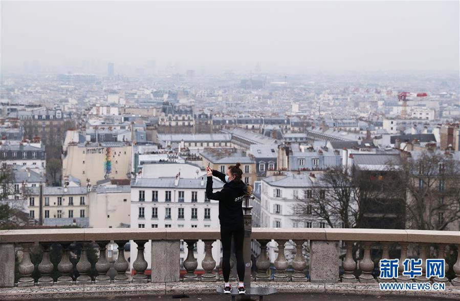 3月18日,在法国巴黎,一名晨练的女子在蒙马特高地拍照。新华社记者高静摄