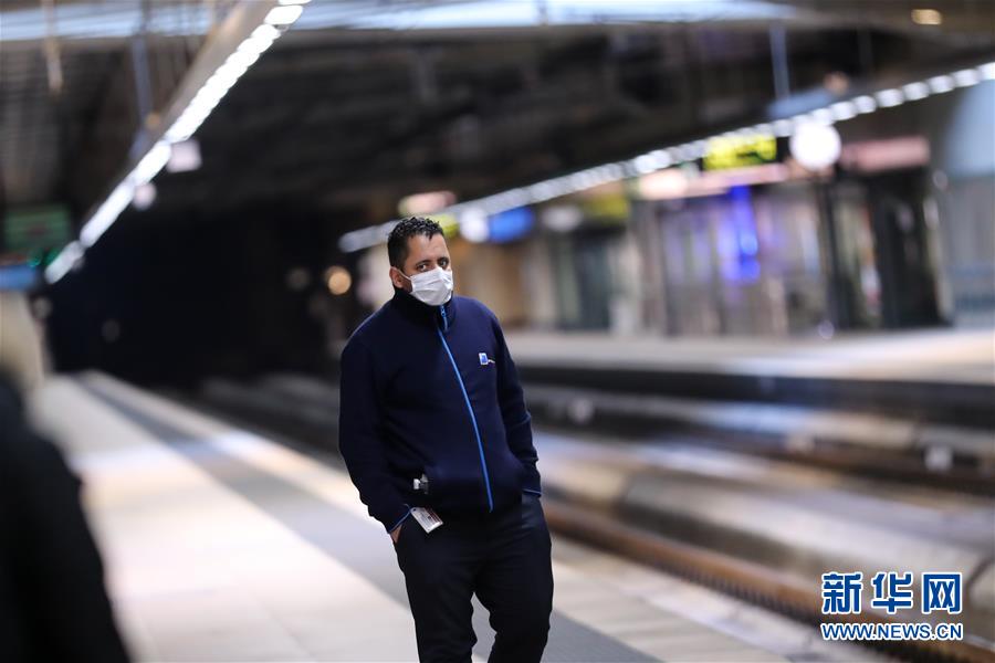3月18日,在比利时布鲁塞尔,一名佩戴口罩的男子在舒曼火车站等车。 新华社记者 张铖 摄