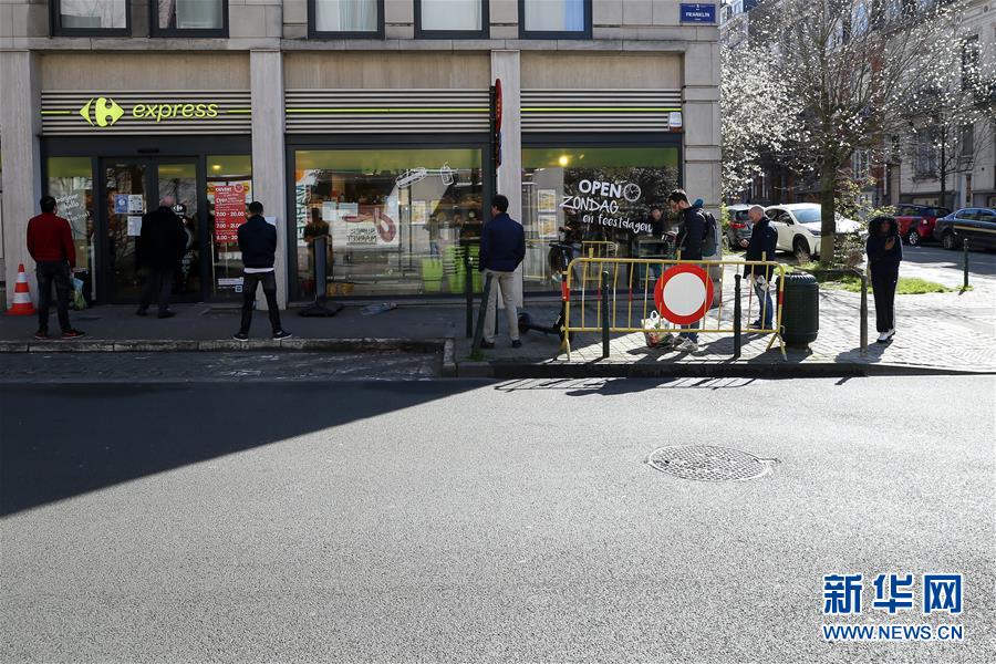 3月18日,在比利时布鲁塞尔,顾客排队等待进入超市购物。 新华社记者 张铖 摄