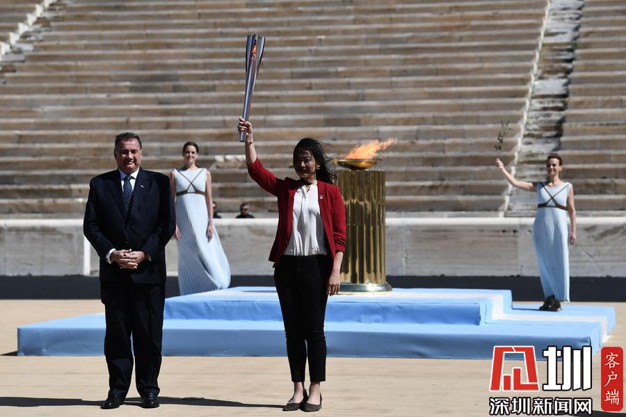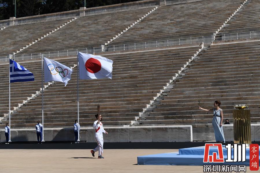 3月19日,日本代表团成员井本直步子(右)从希腊奥委会主席斯皮罗斯·卡普拉洛斯手中接过东京奥运会圣火火炬。