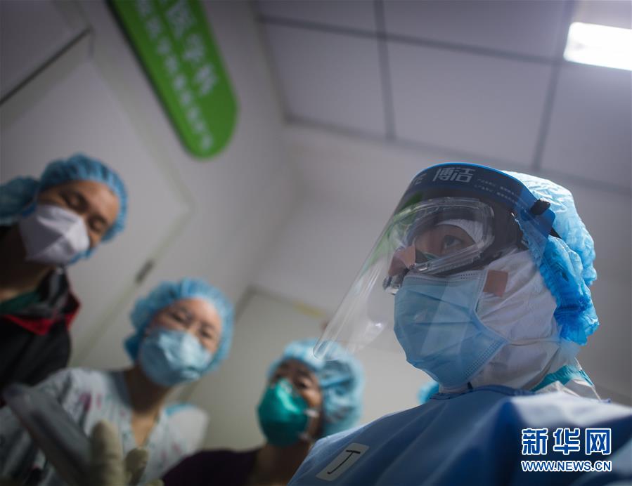 3月19日,在武汉市肺科医院,浙江医疗队队员丁杨(右)准备步入重症监护室。 新华社记者 肖艺九 摄