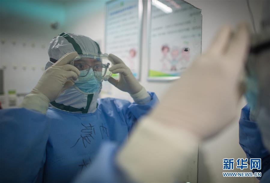 3月19日,在武汉市肺科医院清洁区,内蒙古医疗队队员在穿戴护目镜。 新华社记者 肖艺九 摄
