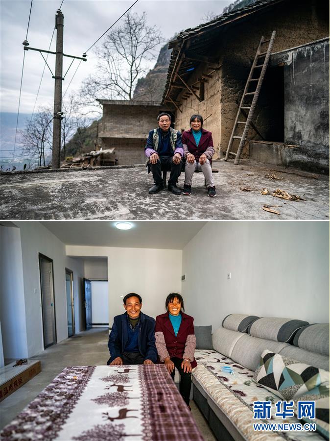 这是一张拼版照片:上图为云南省永善县大兴镇骆丘村村民王大香和丈夫晏付高在生活了二十多年的老屋前合影(3月14日摄);下图为王大香和丈夫晏付高在新家家中合影(3月15日摄)。