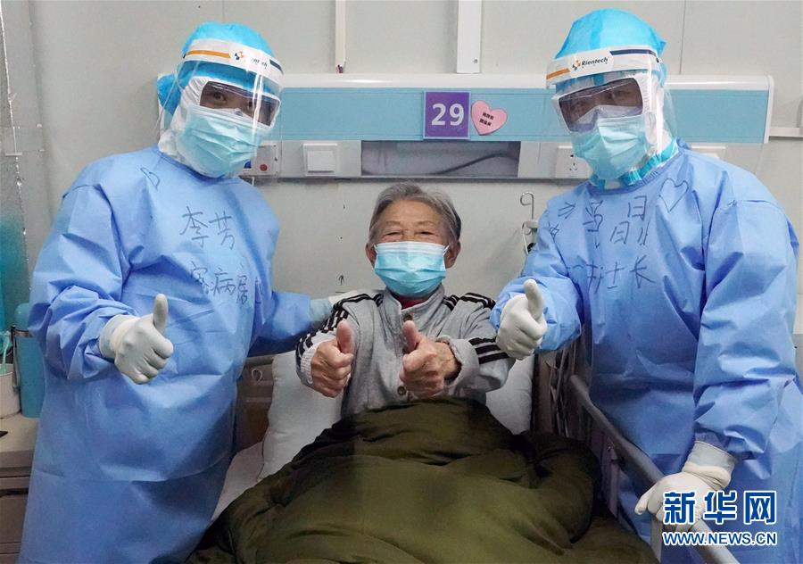 79岁患者李奶奶与护士们合影留念(3月20日摄)。李奶奶受到“家病房”温馨护理后康复很快,她发自内心给医护人员点赞。火神山医院感染三科一病区针对新冠肺炎患者的特点,推出了“家病房”护理模式,从温情照料、精准护理、健康教育、特色照顾等四个方面实施,让患者从入院起就享受家庭的温暖。新华社记者 王毓国 摄
