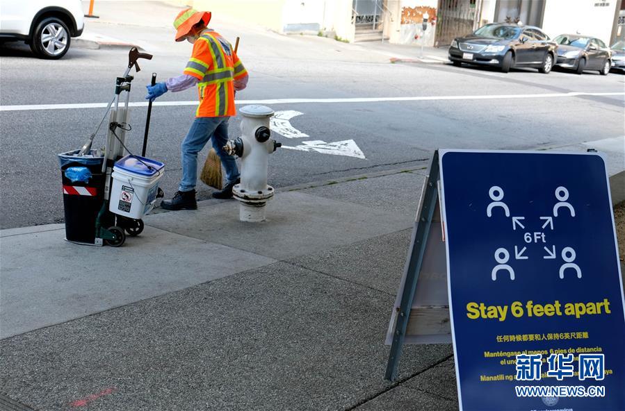 3月20日,一名清洁工在美国加利福尼亚州旧金山唐人街打扫卫生。 新华社记者吴晓凌摄