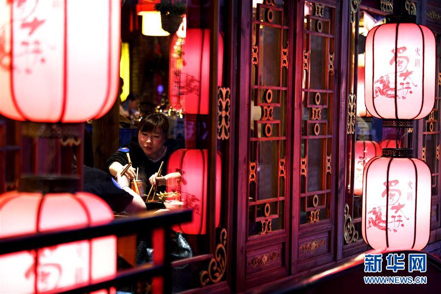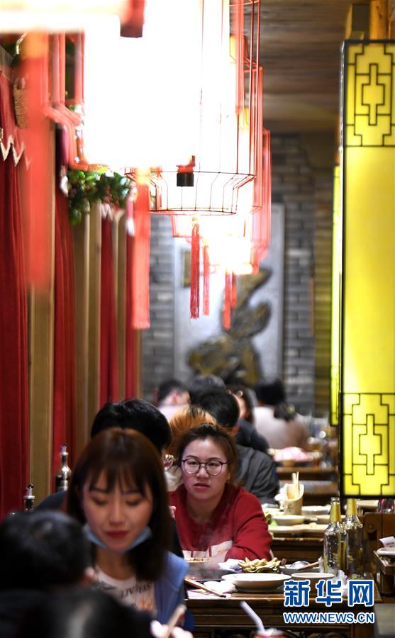 3月21日,在四川省成都市锦江区商业场街的一家火锅店内,顾客在就餐。近日,在做好新冠肺炎疫情防控措施的基础上,四川省成都市的火锅店逐渐恢复营业。新华社记者王曦摄