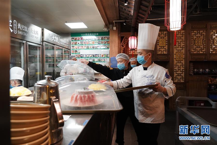 3月21日,在四川省成都市的一家火锅店,工作人员准备上菜。近日,在做好新冠肺炎疫情防控措施的基础上,四川省成都市的火锅店逐渐恢复营业。新华社记者李梦馨摄