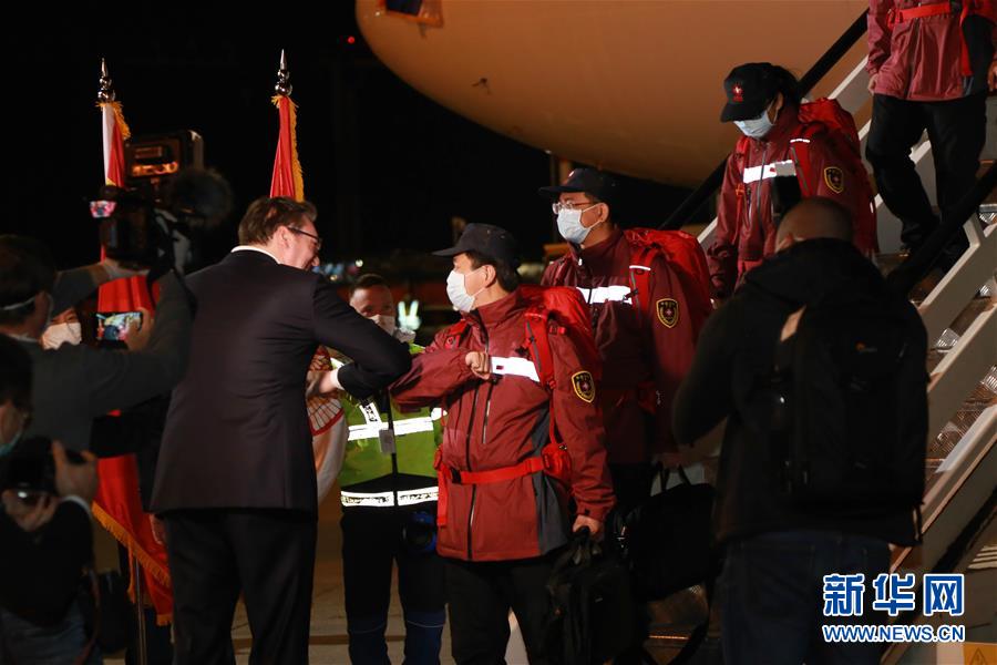 3月21日,在塞尔维亚首都贝尔格莱德,前来迎接的塞尔维亚总统武契奇(左)与中国援助塞尔维亚抗疫医疗专家组成员“碰肘”致意。 中国援助塞尔维亚抗疫医疗专家组一行6人21日晚乘专机抵达塞首都贝尔格莱德,由中国政府捐赠的一批医疗物资同机抵达。 新华社记者 石中玉 摄
