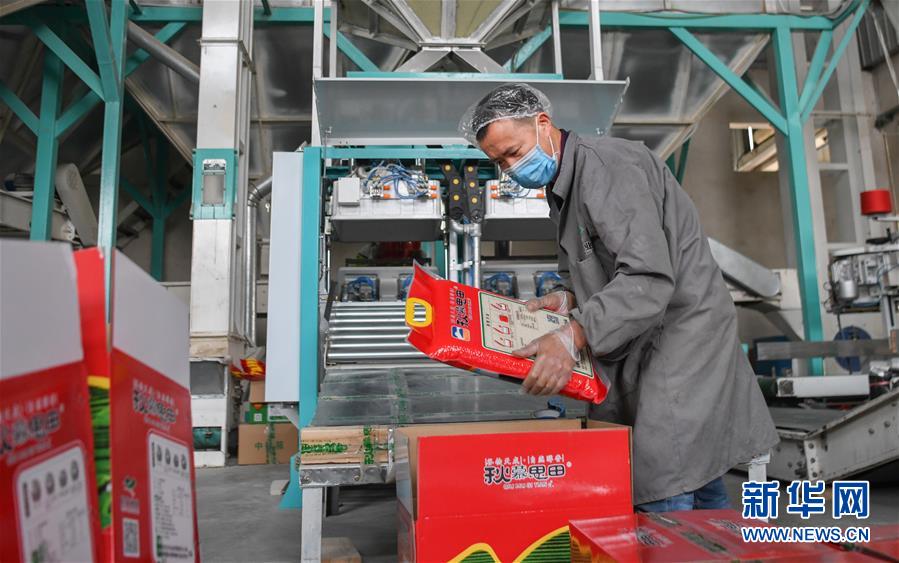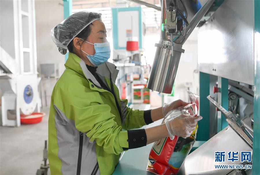 湖北当阳市坝陵办事处群华村村民宋发林(右)和妻子在农产品合作社包装产品,准备通过电商外销(3月21日摄)。近日,湖北当阳市农业生产和农产品加工加速恢复。截至3月19日,当阳市86家规上农产品加工企业复工复产率为84.9%,51家农业产业化重点龙头企业有48家复工复产,占比达94.1%。新华社记者程敏摄