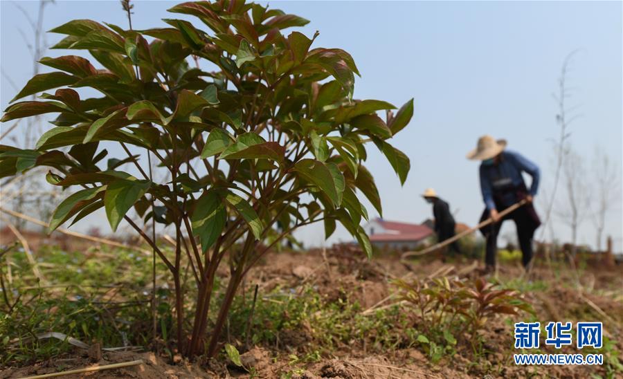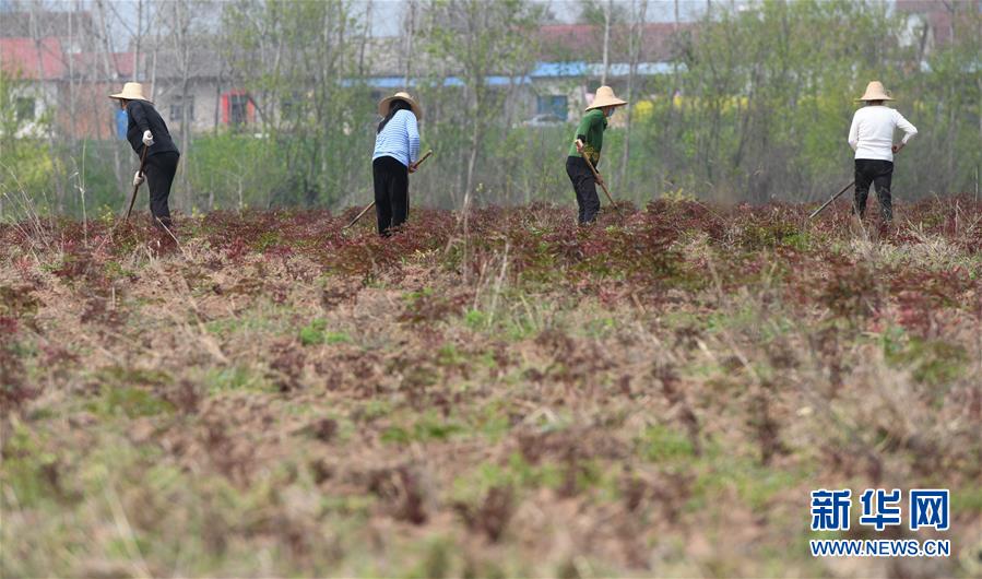 湖北当阳市坝陵办事处群华村农民在中药材白芍田里除草(3月21日摄)。近日,湖北当阳市农业生产和农产品加工加速恢复。截至3月19日,当阳市86家规上农产品加工企业复工复产率为84.9%,51家农业产业化重点龙头企业有48家复工复产,占比达94.1%。新华社记者程敏摄