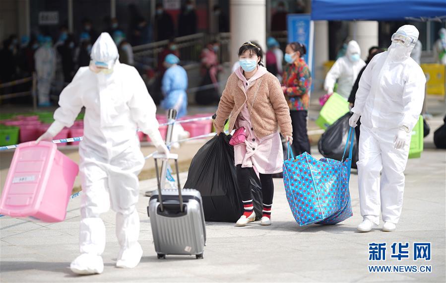 3月10日,在武汉江夏方舱医院,医护人员帮助新冠肺炎治愈患者(中)拿行李。新华社记者才扬摄