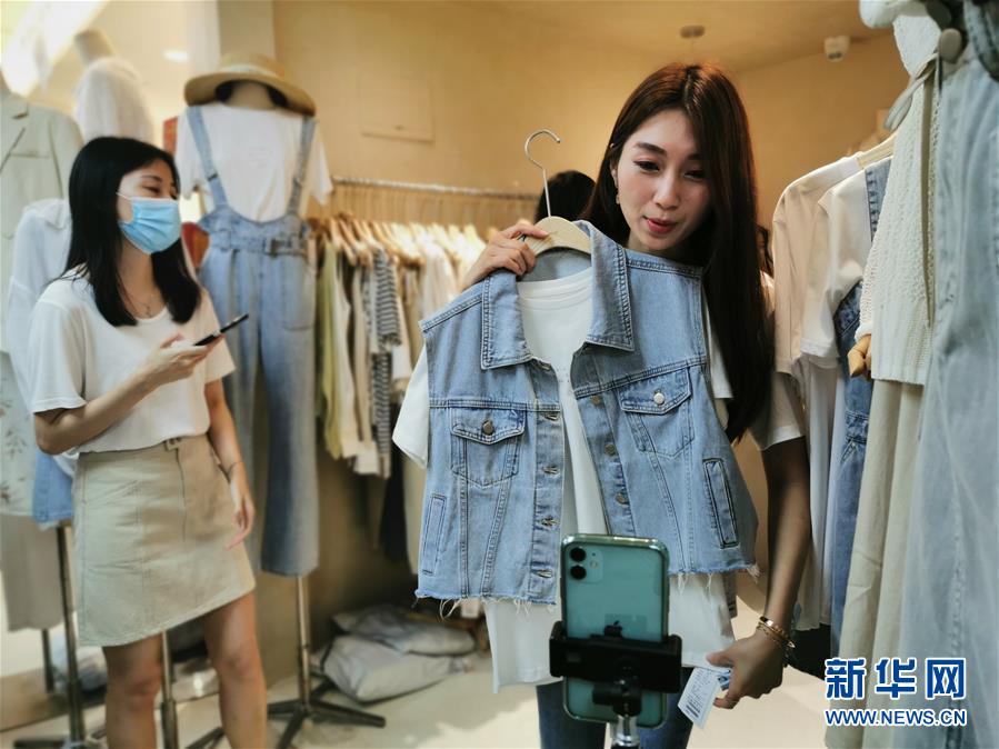 在广州市新中国大厦内,一家服装档口的员工在用手机进行直播(3月21日摄)。新华社记者胡林果摄
