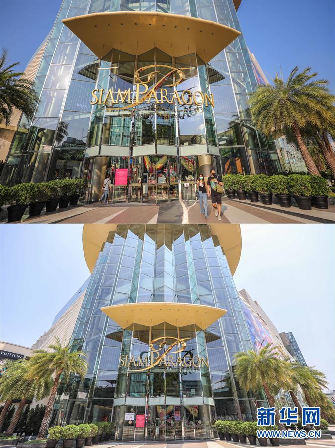这是3月21日拍摄的泰国曼谷暹罗百丽宫商场(上图)和3月22日拍摄的停止营业的商场的对比图。新华社记者张可任摄