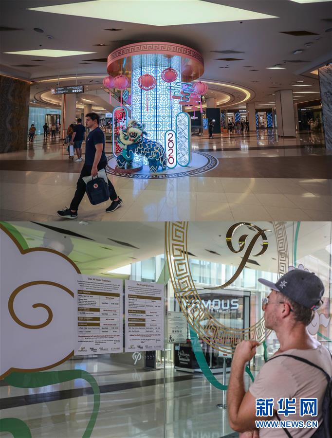 这张拼版照片显示,3月21日顾客在泰国曼谷暹罗百丽宫商场购物(上图)和3月22日一名游客在泰国曼谷暹罗百丽宫商场门口查看停业公告。新华社记者张可任摄