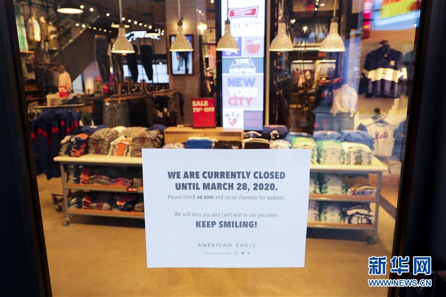 3月21日,在美国纽约时报广场,一家服装店贴出闭店告示。美国纽约州、伊利诺伊州、康涅狄格州20日发布针对本州居民的“居家令”,以遏制新冠病毒传播。这些“居家令”涵盖纽约、洛杉矶、芝加哥等大城市,影响数千万人。白宫20日发表声明说,总统特朗普已宣布纽约州出现“重大灾难”,命令联邦政府支援该州抗击新冠肺炎疫情。新华社记者王迎摄