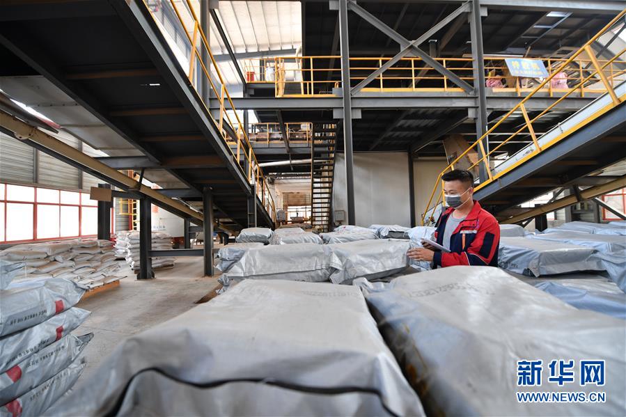 2月26日,在赣州市南康家具产业园,工人清点制作刨花板所用的化工原料。新华社记者胡晨欢摄