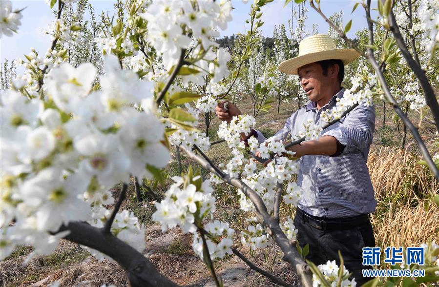 3月22日,云南省曲靖市沾益区炎方乡炎方村的农民在果园里作业。春季里,云南省曲靖市沾益区乡村果园里的桃花梨花竞相绽放,景色秀美,吸引游人前来观光。新华社记者杨宗友摄