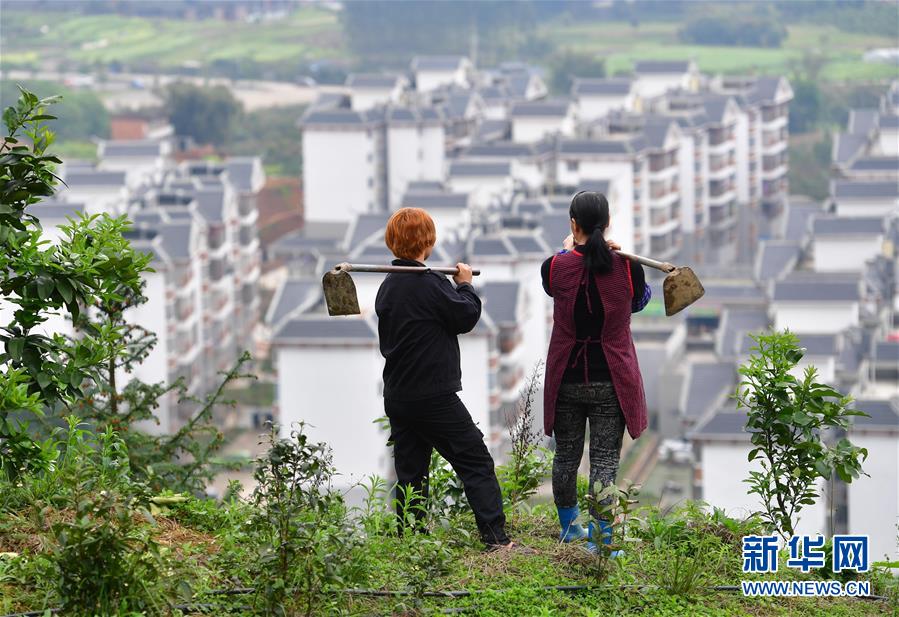 在广西融水苗族自治县县城一处易地扶贫搬迁小区附近,45岁的杨美燕(左)和搬迁户杨鲜花在农场里护理果树(3月13日摄)。