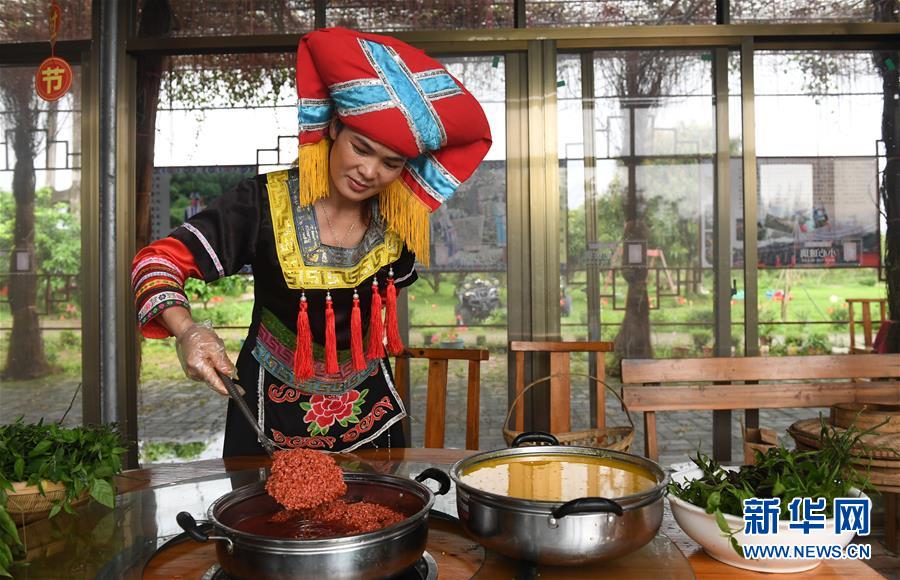 3月25日,在广西上林县巷贤镇,一名壮族女子在查看糯米浸泡染色情况。新华社记者陆波岸摄
