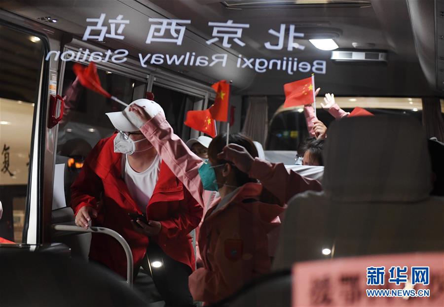 3月25日,援鄂国家医疗队队员抵达北京西站。 当日,首批返京的援鄂国家医疗队队员抵京,他们来自北京中医药大学东直门医院、东方医院和中国医学科学院北京协和医学院。 新华社记者 张晨霖 摄