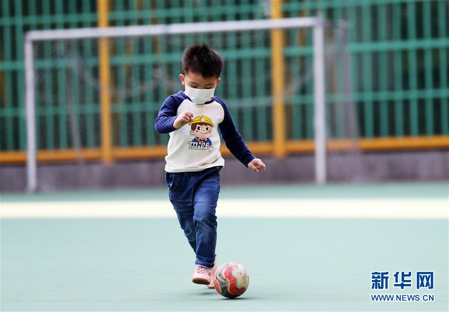 3月24日,在香港西湾河附近的运动场,小朋友在踢足球。 新冠肺炎疫情下,香港民众积极进行多种形式的体育运动。 新华社记者 李钢 摄