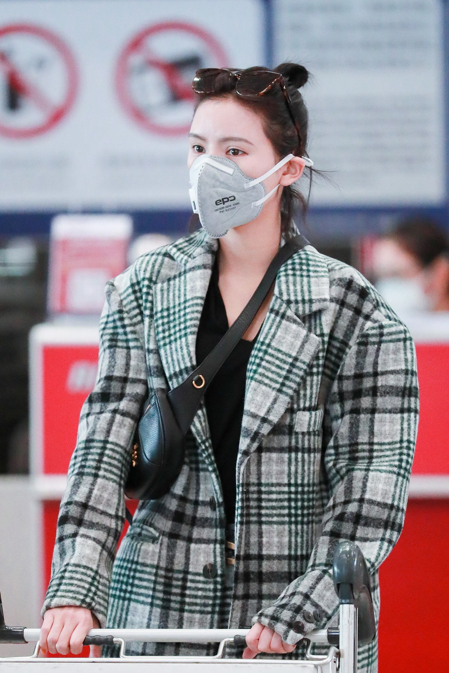 张予曦扎丸子头穿格子西装又美又飒 搭配斜挎小包潮范十足