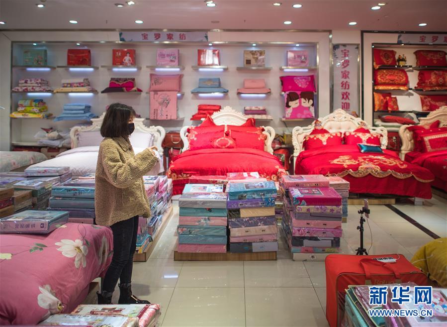 3月29日,在汉口北市场,一名主播在直播平台直播销售床上用品。新华社记者肖艺九摄