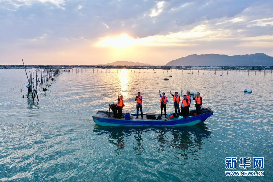 3月26日,福建漳州东山县岐下村村民陈炎松(左一)驾驶着小舢板载着客人返回码头(无人机照片)。新华社记者姜克红摄