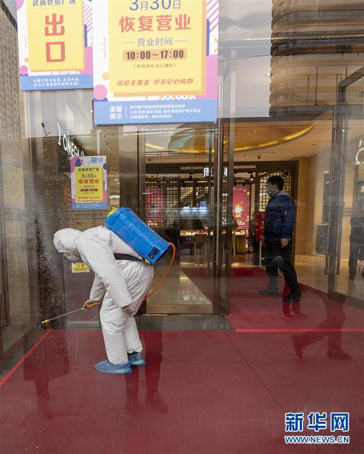 3月30日,在武商世贸广场,工作人员在开门前进行最后的消杀工作。当日,武汉市多家商场开门迎客。新华社记者费茂华摄